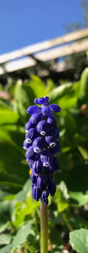 So today I have decided to explore the little bit of greenness that we are lucky enough to have at the back of our house and not simply look through it like I usually do. Once outside I quickly find myself tuning in to the bird song and spot a robin sat under the honeysuckle, diving onto the lawn every so often to eat the insects. I am really noticing the colours of the flowers and the intricacies of their petals. I have found a whole host of primroses on the far side of one of the borders too. The changing shapes of the trees as the new leaves unfurl and the shadows they create because of the low lying sun. There is a heavy scent in the air which, after googling it ,I discover is the muscari. It likes it in the shade apparently and we have a lot of that.